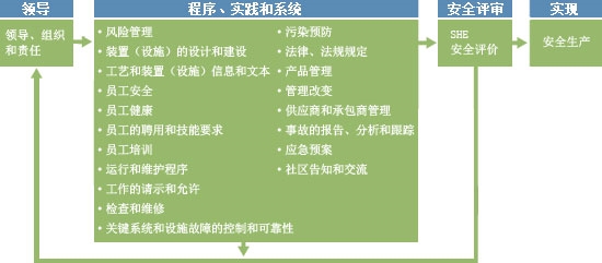 中国化工从体系建设入手,在原有的“两标一体(GB/T28001《职业健康安全管理体系规范》、GB/T24001《环境管理体系规范及使用指南》)”基础上,吸收海外企业凯诺斯的成功做法和经验,结合信息化建设,于2010年初步建成具有中国化工特色的SHE(安全、健康、环境)管理体系,为提升安全管理水平奠定了坚实的基础。