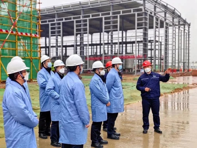 ▲在项目建设现场,了解新建电解液项目新工艺和总体进度