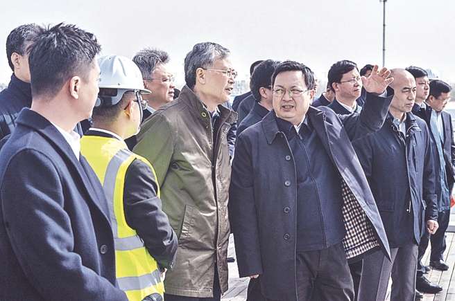 调研当天,李凡荣和张国华共同见证001大厦正负零浇筑。随着施工负责人的指令下达,001大厦地下一层混凝土正式开始浇筑,正负零节点顺利达成,这也标志着001大厦顺利完成地下结构施工,即将全面进入地上施工阶段,“金芦苇”将破土而出,拔节生长。