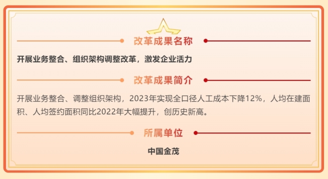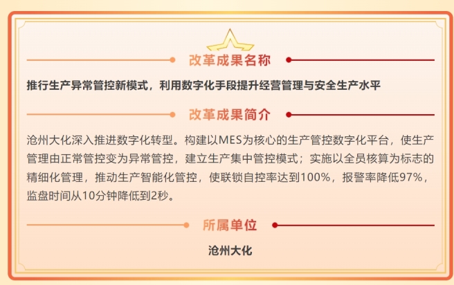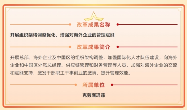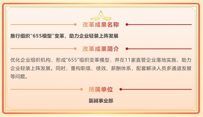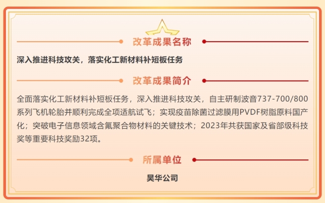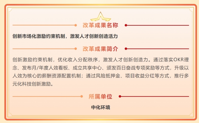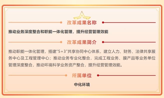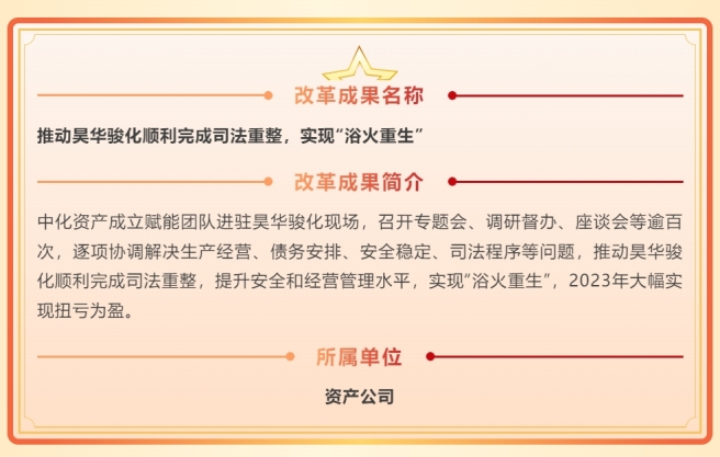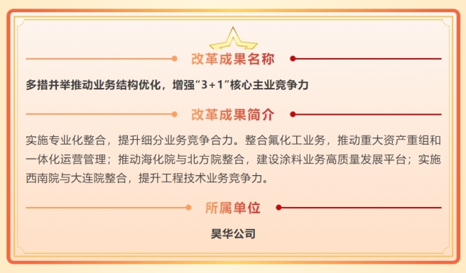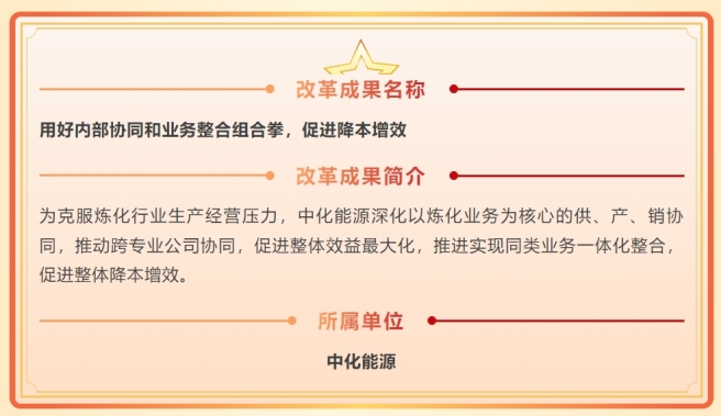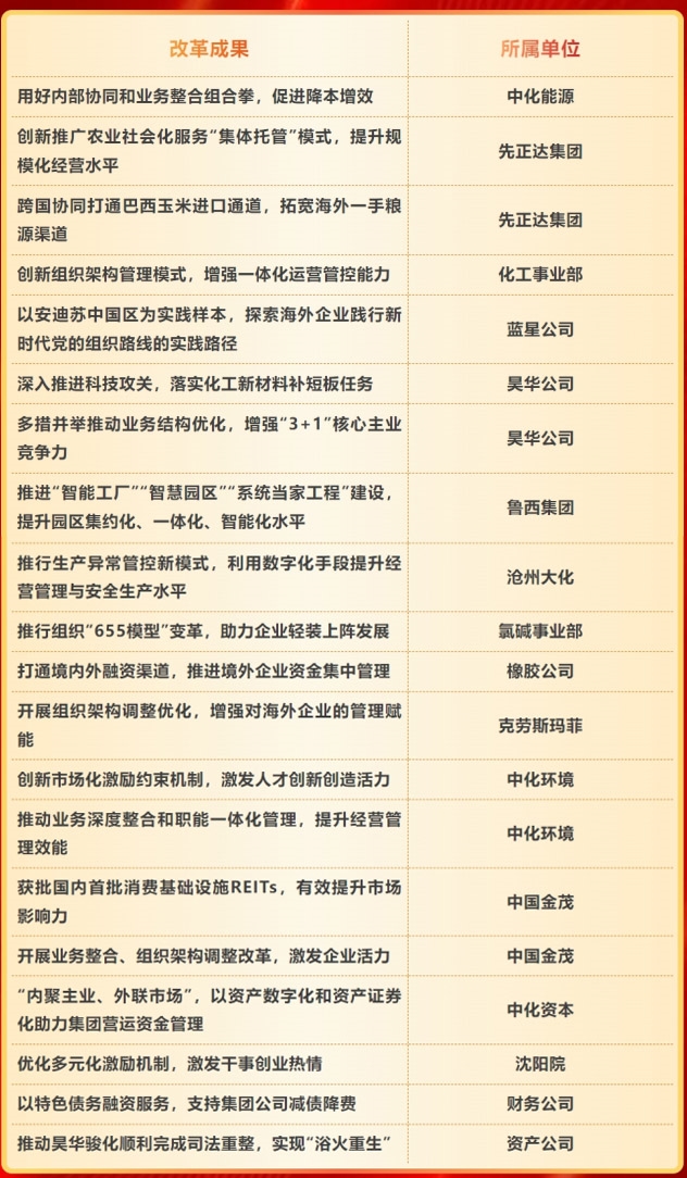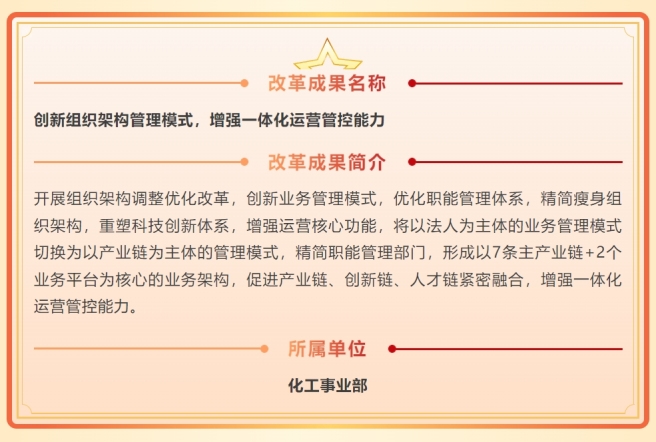 为表扬先进、营造氛围,鼓励各单位积极主动改革,开创公司高质量发展新局面,公司开展“中国中化2023年度改革优秀成果”评选工作,最终评选出20项具有一定变革性、创新性、特色性的优秀改革成果。这些改革成果,亮点纷呈、各具特色,充分展现了改革创新是驱动企业发展的不竭动力。