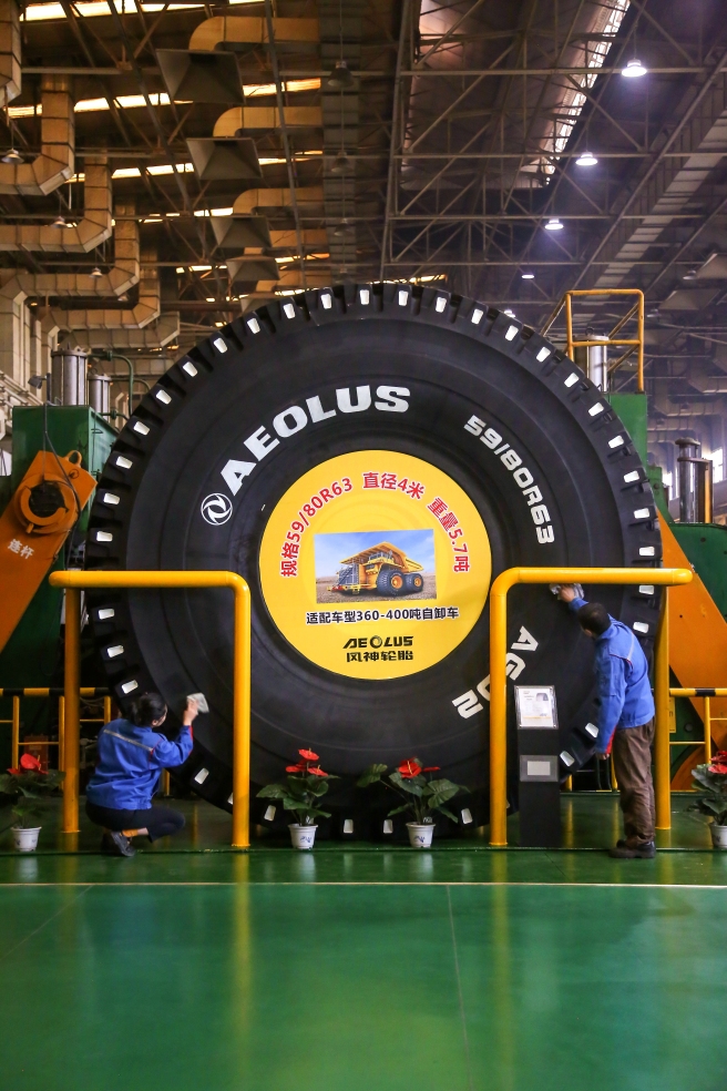此次成功下线的巨型轮胎由风神轮胎自主研发生产,直径超过4米,相当于一辆家用小汽车的长度;重量近6吨,相当于3辆家用小汽车的重量,主要用于400吨左右的巨型矿用自卸车。