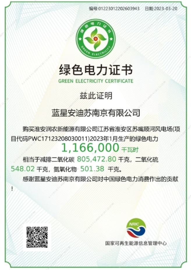 日前,国家可再生能源信息管理中心为安迪苏南京工厂核发116.6万千瓦时绿色电力消费证书,这是公司2023年1月参与绿色电力交易的凭证。