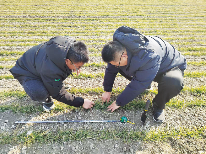 农艺师采用“1米双行法”对麦田进行取样,现场测定总茎数、土壤墒情等关键指标,并结合麦苗分蘖与根系发育情况,科学研判田间长势。通过墒情、苗情、温度等多维度数据的交叉分析,团队精准识别弱苗促壮需求,制定麦苗返青期的精准营养管理方案,为小麦稳产夯实基础。